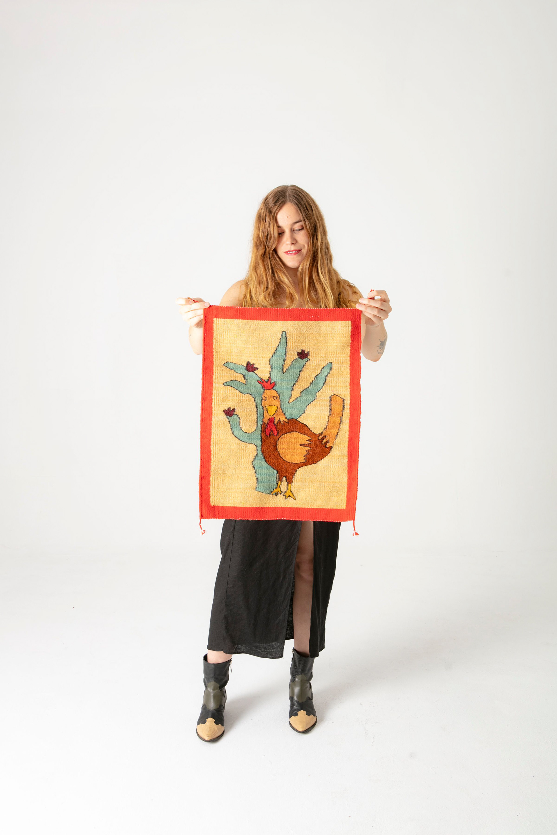 EL GALLO, EL CANTO, EL RAYO (2022) Gobelino de lana teñida con tintes naturales tejida en telar de pedal/ 58x42cm